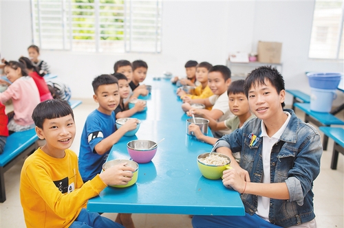 近日,在乐东黎族自治县利国镇的文史小学,学生们在食堂用餐。该校贫困户学生每人每年可以获得2400元特惠性补助。据了解,我省2019年“两不愁三保障”任务基本完成。义务教育保障方面,春季学期教育扶贫特惠性资金发放13.38万人,秋季学期发放14.96万人,全年共发放资金3.26亿元,发放率100%。海南日报记者 袁琛 摄