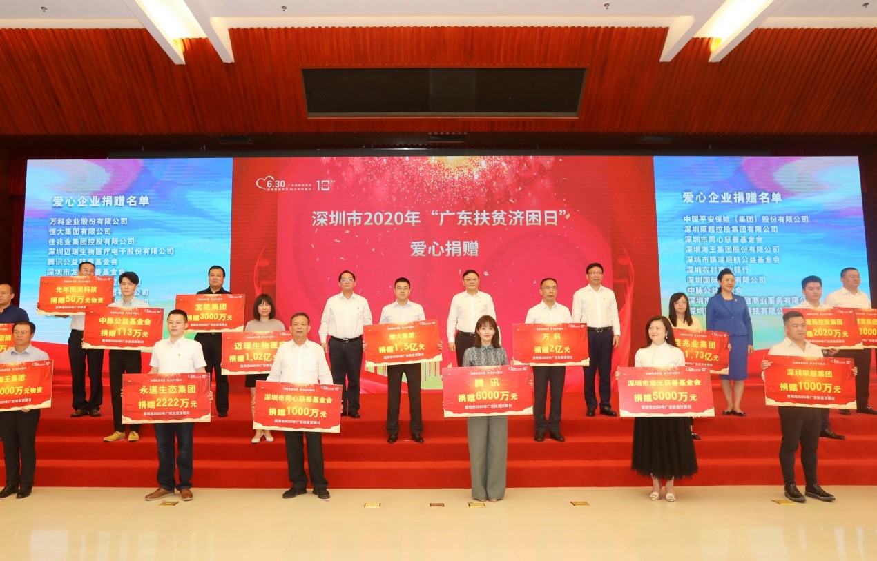 6月30日上午,2020年广东扶贫济困日活动在广州举行,广东省委书记李希、省长马兴瑞、省人大常委会主任李玉妹、省政协主席王荣等领导出席并会见了恒大集团董事局副主席、总裁夏海钧等爱心企业、爱心人士代表。在活动仪式上,恒大集团向广东省扶贫基金会捐赠6亿元,向深圳市慈善会捐赠1.5亿元。