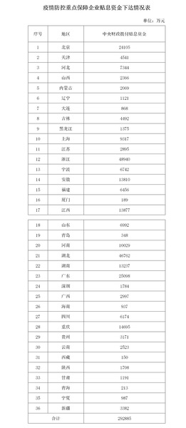 疫情防控重点保障企业贴息资金下达情况表(来源:财政部)