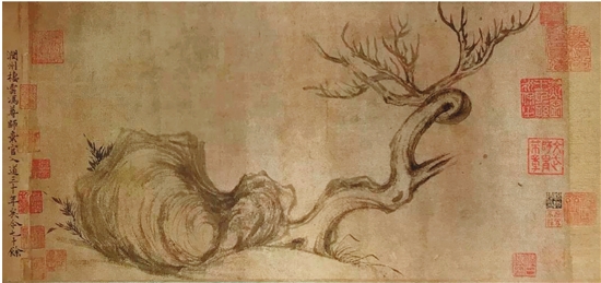 枯是荣的极大反差、强烈对比。故在山水画幅里的杂树中,准间有一二枯枝枯干,枯藤之上,几点寒鸦,枯松躯干,乱苔寄生。诗文里,留得枯荷听雨声,菊暗荷枯一夜霜?;缰凶ㄓ斜硐挚莞傻母呤?,北宋沈括便有“枯木关仝最难比”的说法,苏东坡更绘有《枯木竹石图》。东坡此图画的是一块巨石压着一颗干枯的弯树,石下生出几丛嫩竹,北宋画家米芾《画史》说他“子瞻作枯木,枝干虬屈无端。石皴硬,亦怪怪奇奇无端,如其胸中盘郁也”,故将枯木竹石画得诡谲不经、奇形怪状。