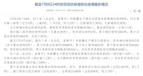 情况显露,截至7月8日24时,据31个?。ㄗ灾吻?、直辖市)和新疆生产建设兵团报告,现有确诊病例357例(其中重症病例5例),累计治愈出院病例78590例,累计死亡病例4634例,累计报告确诊病例83581例,现有疑似病例5例。累计追踪到密切接触者765344人,尚在医学观察的密切接触者3840人。