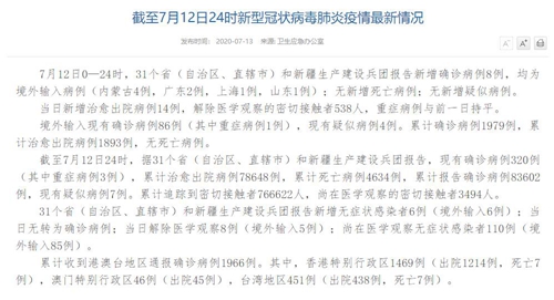 情况显示,截至7月12日24时,据31个省(自治区、直辖市)和新疆生产建设兵团报告,现有确诊病例320例(其中重症病例3例),累计治愈出院病例78648例,累计死亡病例4634例,累计报告确诊病例83602例,现有疑似病例7例。累计追踪到密切接触者766622人,尚在医学观察的密切接触者3494人。