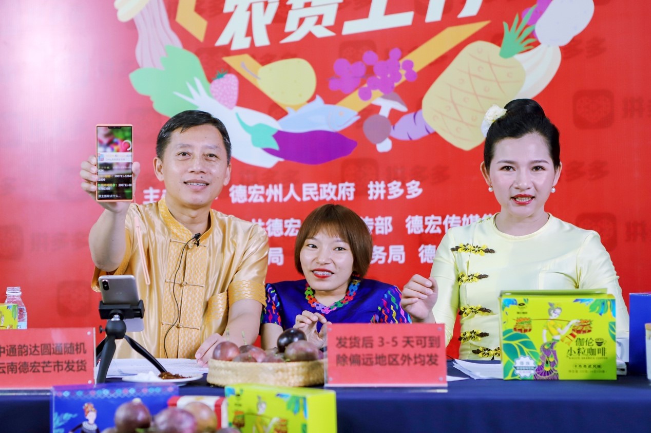 德宏州委副书记、州长卫岗(左)与残疾人主播李木兰(中)一起,推荐德宏百香果并为网友发福利。(摄影:赖文杰)