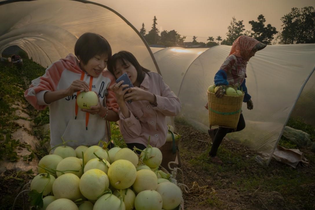 李木兰(左)和姐妹金玉萍(右)一边整理刚从地里摘出来的甜瓜,一边拿起手机当起客服及时回复提问。两人一起创业,并取了个“锦鲤组合”的名字,寓意着给自己和别人都带来好运。(摄影:穆功)