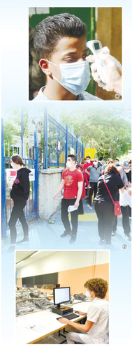 图①:6月21日,埃及开罗的一处考场外,考生正在接受体温检测。