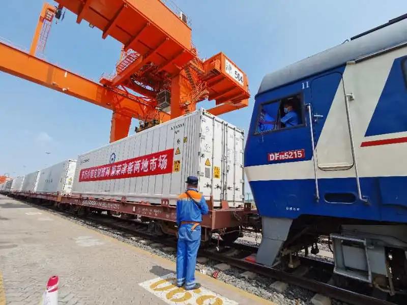 7月16日10时30分,编有8辆冷藏集装箱的46112次货物列车,满载着肉类、蔬菜从中国铁路北京局集团有限公司京铁物流中心天津集装箱中心站发出,驶向成都市城厢火车站。这是天津港区开出的首趟整列冷藏集装箱铁路班列。