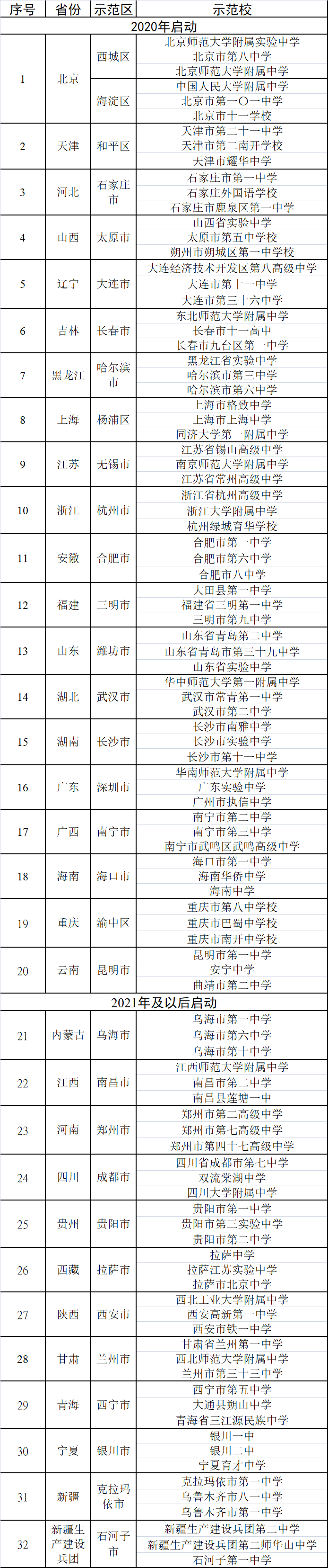 近日,教育部发布厅通知,明确从2020年开始分批启动普通高中新课程新教材实施国家级示范区和示范校建设工作,每批建设周期为3年。今年共有21个省份启动首批示范区和示范校建设,其中北京西城、海淀两区6所知名高中入选,分别为北师大附属实验中学、北京八中、北师大附中、人大附中、101中学、十一学校。