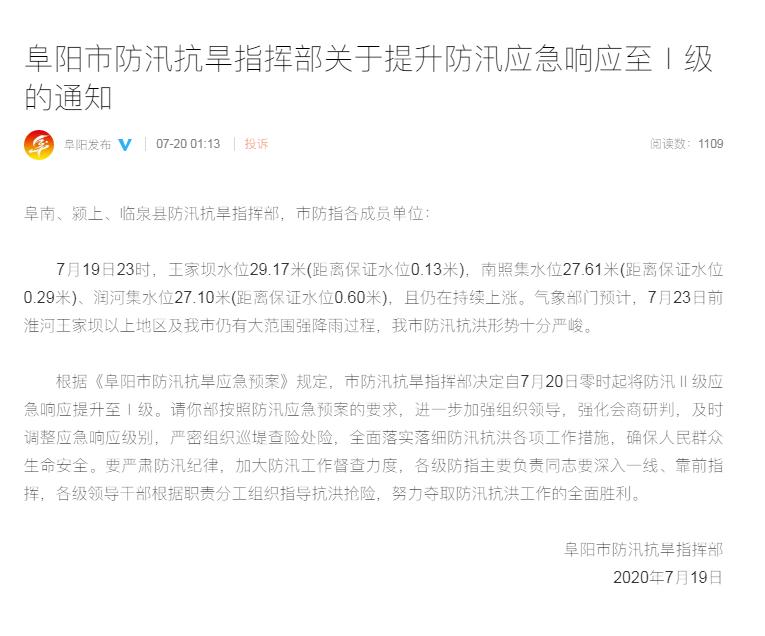 安徽阜阳提升防汛应急响应至Ⅰ级