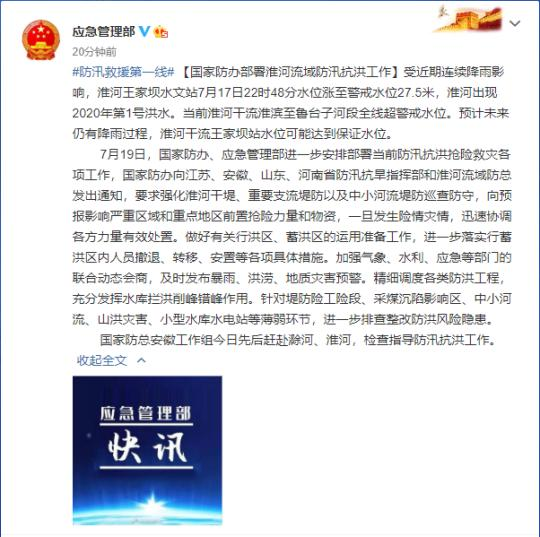 7月19日,国家防办、应急管理部进一步安排部署当前防汛抗洪抢险救灾各项工作,国家防办向江苏、安徽、山东、河南省防汛抗旱指挥部和淮河流域防总发出通知,要求强化淮河干堤、重要支流堤防以及中小河流堤防巡查防守,向预报影响严重区域和重点地区前置抢险力量和物资,一旦发生险情灾情,迅速协调各方力量有效处置。做好有关行洪区、蓄洪区的运用准备工作,进一步落实行蓄洪区内人员撤退、转移、安置等各项具体措施。加强气象、水利、应急等部门的联合动态会商,及时发布暴雨、洪涝、地质灾害预警。精细调度各类防洪工程,充分发挥水库拦洪削峰错峰作用。针对堤防险工险段、采煤沉陷影响区、中小河流、山洪灾害、小型水库水电站等薄弱环节,进一步排查整改防洪风险隐患。