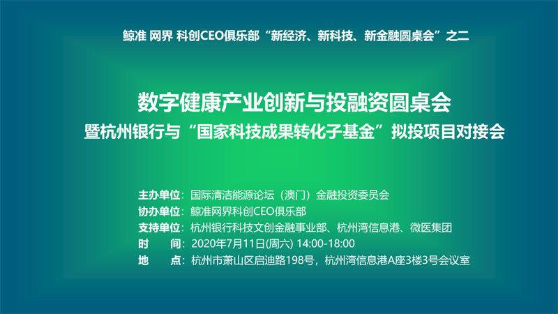 人民政协网7月21日电 2020年7月11日,“数字健康产业创新与投融资”研讨对接会议在杭州萧山杭州湾信息港(国家级科技企业孵化器)召开。本次会议由国际清洁能源论坛(澳门)金融投资委员会、鲸准网界CEO科创俱乐部主办,杭州湾信息港、微医集团协办?;嵋槲菩禄?、新科技、新经济主题,就互联网医疗、数字健康大数据、新能源科技产业展开深度分析与前景展望,并进行投资分析与案例分享。