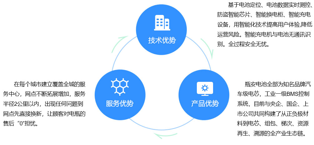 上海瓶安新能源有限公司,主营业务为面向电动两轮、三轮车用户,提供专业、安全的锂电池产品,公司汇聚中科院团队主力研发,保证产品的先进科技含量,安全节能要求。瓶安为电动自行车用户提供智能安全锂电池租赁服务,不仅比用户购买电池更实惠,还解决了用户电池断电、被盗、续航、爆炸等诸多使用痛点,更重要的是,此项业务积极响应国家政策,贯彻执行国家绿色节能政策的有关文件,锂电池将全面替换高污染的铅酸电池。租赁锂电池退役后可有效回收、梯次利用。