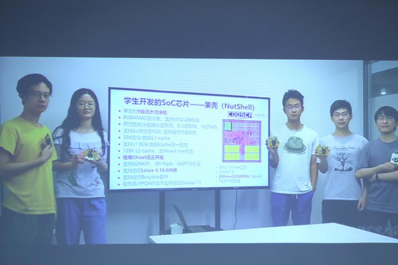 学生们将这款处理器芯片命名为“果壳(NutShell)”,与“国科”发音相同。他们希望通过自己设计的处理器芯片来寄托对国科大深厚的情感?!肮恰钡纳杓圃创胍丫蚬噬缜?。