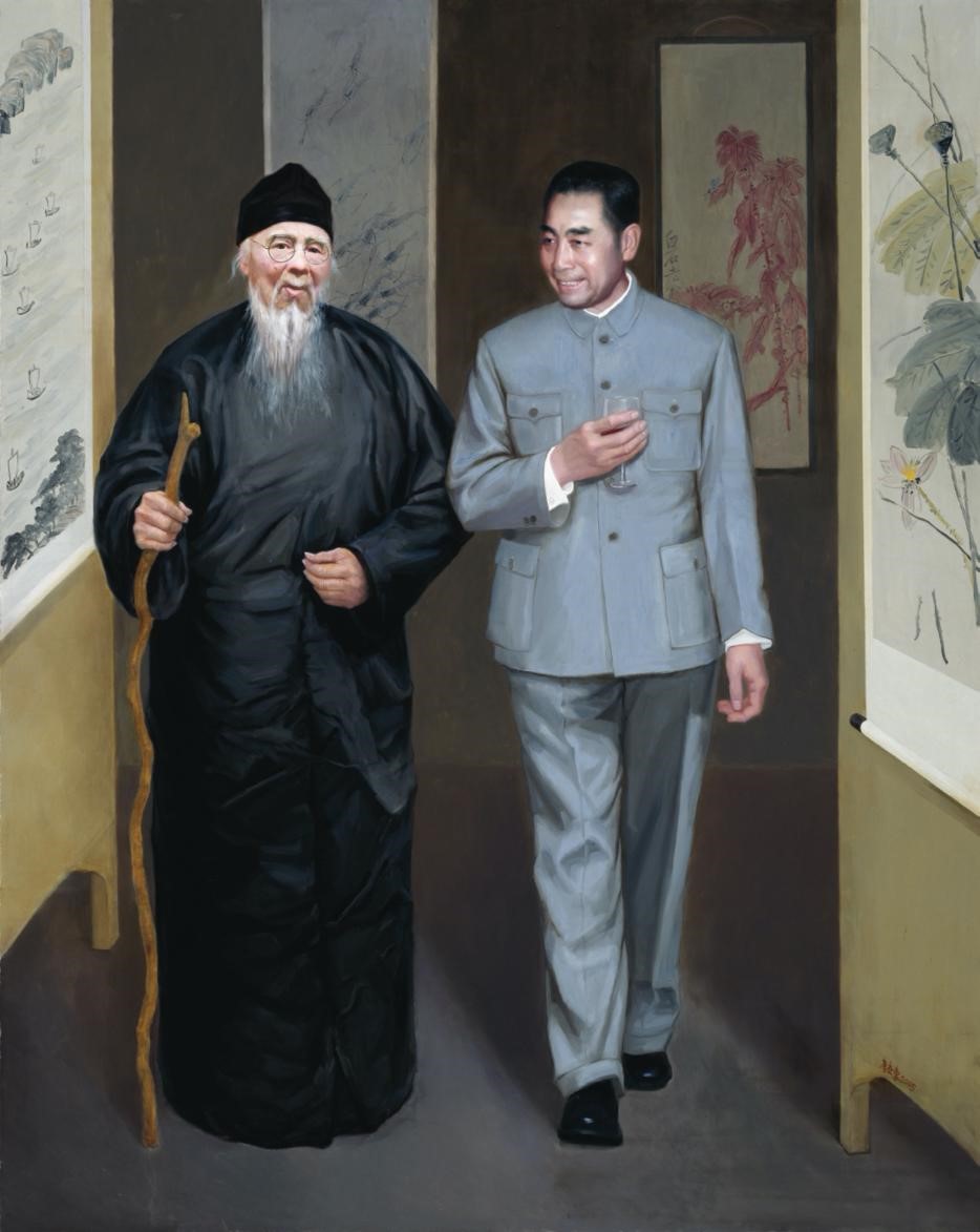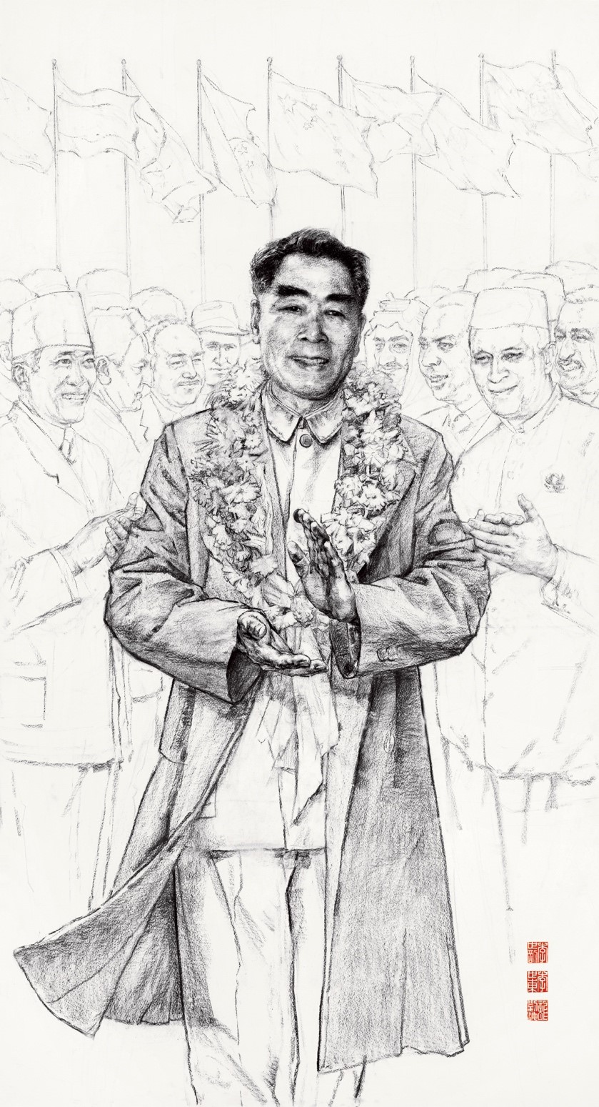 李世刚、李世东、刘海龙三位艺术家多年来专注钻研周恩来总理的历史生平,通过描绘总理浩然正气的伟岸形象,抒写对社会民生的关切之情。开幕式上,艺术家代表李世刚向现场嘉宾分享了他的创作初衷:“‘丹心谱’展览在山东美术馆展出,是我们第一次回家乡山东举办的汇报展,具有重要意义。习近平总书记曾说过,‘周恩来同志是近代以来中华民族的一颗璀璨巨星,是中国共产党人的一面不朽旗帜。’周总理的伟大精神与高尚品质一直深深激励着我们,我、李世东、刘海龙多年来以周恩来总理光辉形象为主题进行创作,期望通过艺术的表现形式,深切表达我们对周总理的敬仰与爱戴。我们画总理、学总理,就是要表现周总理上下求索、英勇奋斗的人生足迹,带着怀念、带着思索、带着坚守,来感受、触摸总理的坚毅与温情?!?/p>