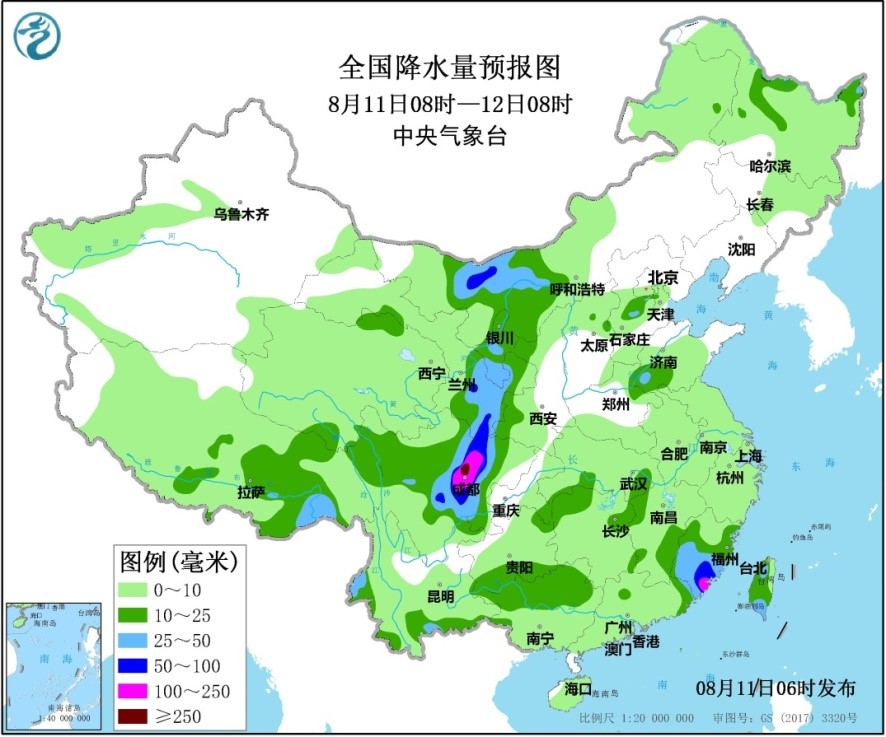 受其影响,11日10时至12日10时,福建中南部、江西东南部及台湾岛南部有大到暴雨,福建南部局地大暴雨(100~180毫米);台湾海峡、东海西部、福建沿海、浙江沿海将有6~7级大风,其中福建南部沿海、台湾海峡南部海面将有8~9级大风,局地风力有10级,阵风可达11~12级。