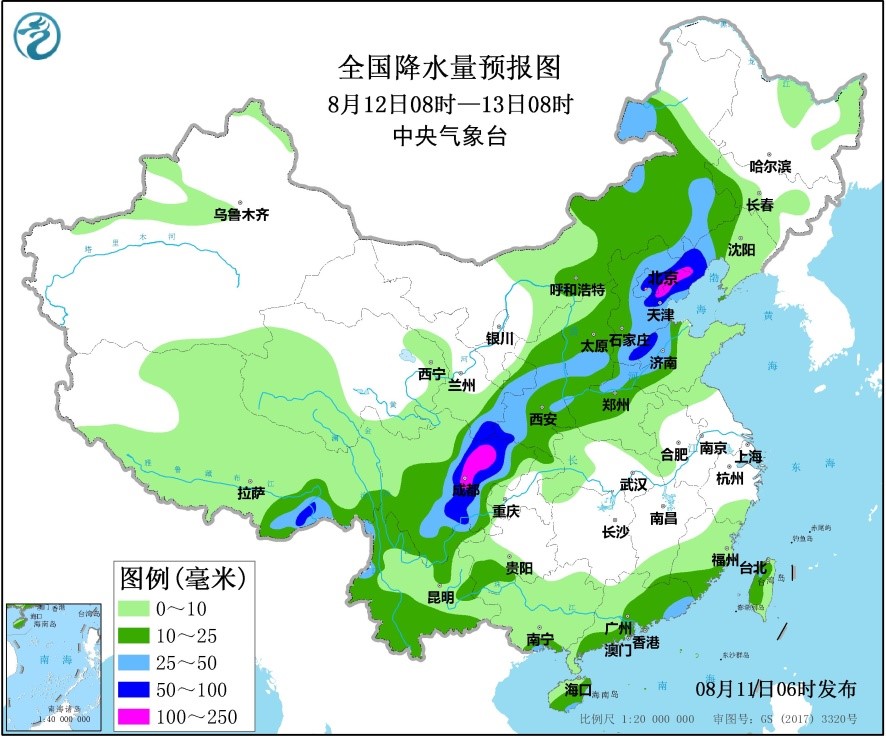预计11日至13日,北方将有大范围强降雨过程,西北地区东部、内蒙古、华北、黄淮北部、东北地区等地将先后有中到大雨,局地暴雨或大暴雨,累计降水量60~120毫米,京津冀等地局地150~200毫米,并伴有短时强降雨(最大小时降雨量30~50毫米,陕西南部、甘肃南部及京津冀局地有80~100毫米)、雷暴大风或冰雹等强对流天气。京津冀等地将出现入汛以来最强降雨。具体预报如下:
