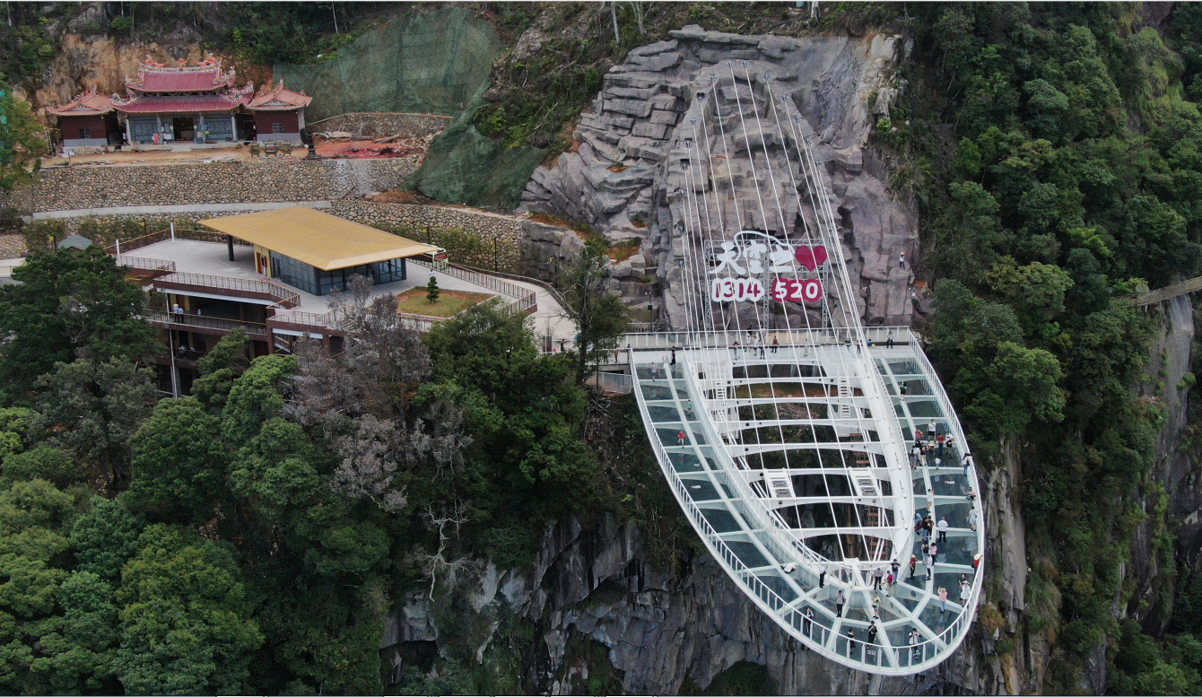 瀑布斜上方是新建设的玻璃观景台——“天空之心”,站在上面可俯瞰岱仙瀑布全景,有“人在空中走,景在脚下游”的美妙体验。观景台悬空高度达314米,外挑悬空长度约52米,总面积520平方米,组合成数字“1314520”,象征“一生一世我爱你”。
