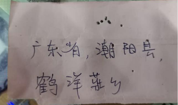 "广东省,潮阳县,鹤洋莊乡",马来西亚华人庄汉信的爷爷将家乡的地址写在纸条上,希望子孙后代有朝一日能借此回国寻根。