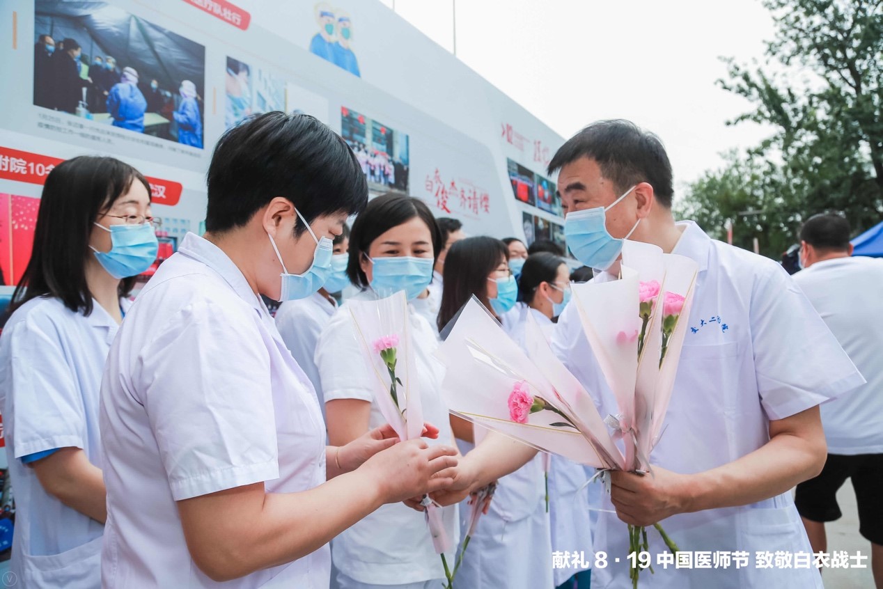 正值第三个医师节,微医互联网总医院、万向集团、民生通惠公益基金会发起“致敬白衣战士公益行动”,分别向北京、上海、武汉、青岛等35个城市的近百家医院,送出上万枝鲜花,共同为佑护生命的白衣战士点赞。