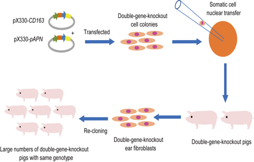 为实现上述目标,研发团队以大白猪为研究对象,采用基因编辑技术同时对CD163基因第七外显子和pAPN基因第二外显子进行编辑,使病毒受体CD163和pAPN蛋白失活,成功获得CD163和pAPN双基因编辑猪?;钐骞ザ窘峁砻?该双基因编辑猪可同时抵抗猪繁殖与呼吸综合征病毒和传染性胃肠炎病毒感染;并显著性抑制猪德尔塔冠状病毒的感染;首次提供了pAPN作为猪德尔塔冠状病毒受体之一的活体实验证据。上述三种病毒在未经编辑的野生型对照猪均能建立感染并导致其发病。通过多年饲养观察、繁殖和国家种猪测定中心性能测定及屠宰实验,表明该双基因编辑猪繁殖及生产性能正常。