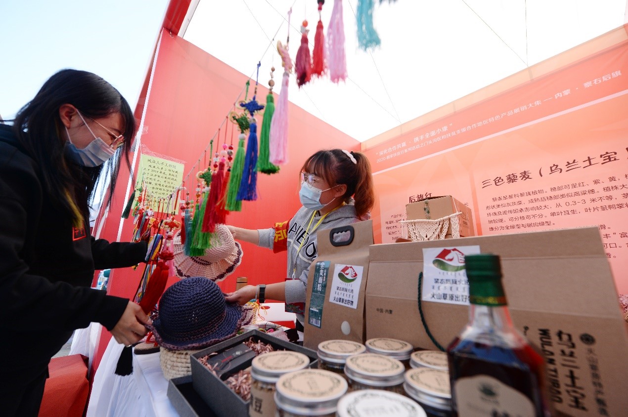 在展销大集活动上,来自涿鹿、武川、察右后旗、堆龙德庆、神农架和门头沟区的40多家参展单位,带着干鲜果品、杂粮、后旗红马铃薯、草原雪菊、牛肉干、胡麻油、莜麦、奶制品、藜麦、糌粑、茶叶、红酒……300多种门头沟区对口扶贫支援合作地区特色产品在展销大集的26个展棚内惊艳亮相。