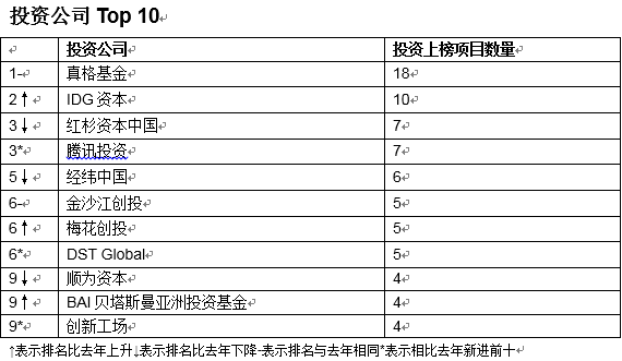 在投资公司榜单中,徐小平所引领的真格基金连续第二年排名第一,IDG资本超过红杉资本中国排到第二,红杉资本中国和腾讯投资并列第三。这些投资机构对年轻企业家有非常重要的推动作用。