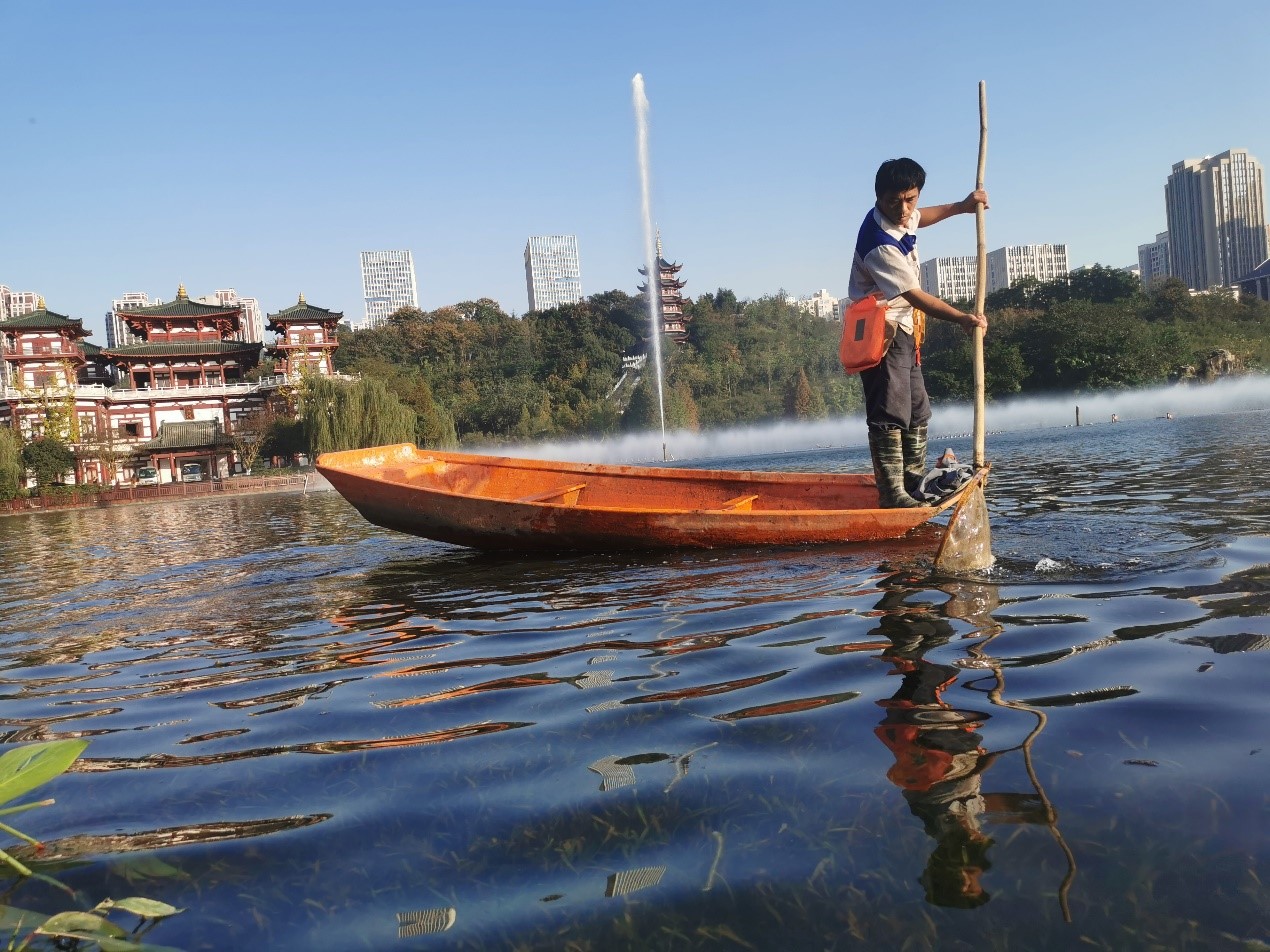 工作人员在湖面对杂质进行打捞并观察水底环境。人民政协网记者 付振强 摄