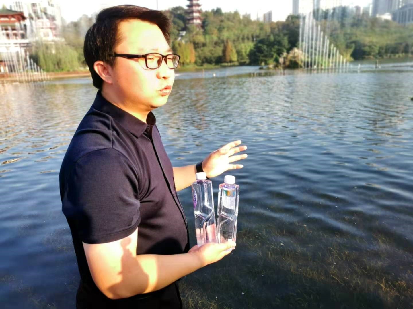兴龙湖水体生态修复相关负责人谢丹向记者展示湖水与瓶装矿泉水。人民政协网记者 付振强 摄