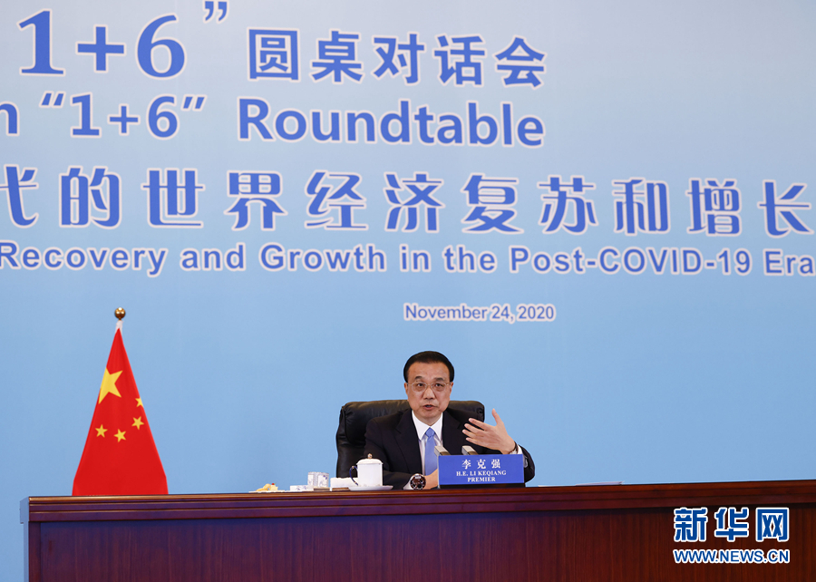 新华社北京11月24日电(记者郑明达)国务院总理李克强11月24日晚在钓鱼台国宾馆同世界银行行长马尔帕斯、国际货币基金组织总裁格奥尔基耶娃、世界贸易组织副总干事沃尔夫、国际劳工组织总干事赖德、经济合作与发展组织秘书长古里亚和金融稳定理事会主席夸尔斯举行第五次“1+6”圆桌对话会?;嵋橐允悠捣绞骄傩?,围绕“促进后疫情时代的世界经济复苏和增长”主题,就世界经济形势、中国经济形势以及后疫情全球经济治理等议题深入交流。