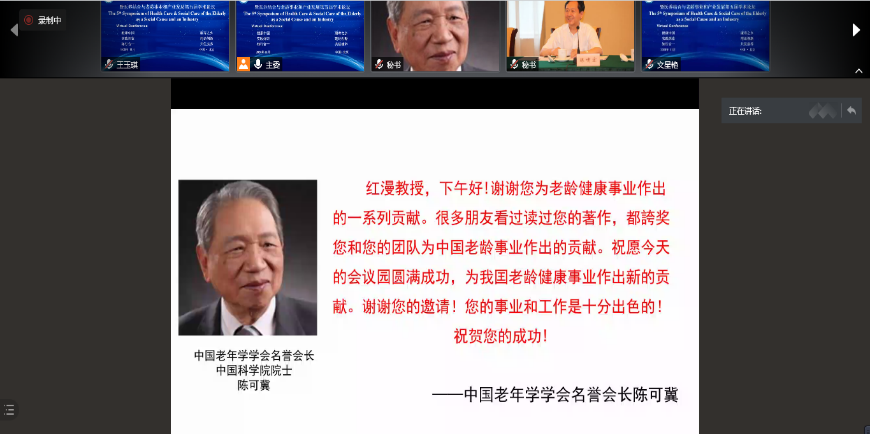 接着,由老年医学学会名誉会长陈可冀院士以及老年健康专委会荣誉顾问陈啸宏先生作线上致辞。陈可冀会长如是说:红漫教授,下午好!谢谢您为老龄健康事业作出的一系列贡献。很多朋友看过读过您的著作.都誇奖您和您的团队为中国老龄事业作出的贡献。祝愿今天的会议园圆满成功,为我囯老龄健康事业作出新的贡献。谢谢您的邀请!您的事业和工作是十分出色的!祝贺您的成功!陈啸宏顾问如是说:王红漫教授、各位专家,大家下午好!在此再次祝贺《老年健康蓝皮书:中国健康老龄化研究与施策(2020)》出版发行,对大家在中国老龄健康研究领域作出的贡献表示感谢,并预祝今天的研讨会圆满成功!