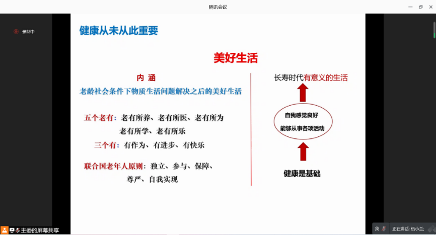 会议还重温了国务院原秘书长、原卫生部部长、中国卫生经济学会总顾问高强和第十二届全国政协副主席、中国科学院院士、中国科协名誉主席韩启德两位领导在《老年健康蓝皮书--中国健康老龄化研究与施策(2020)》新书发布仪式上的讲话。供与会者学习共勉。