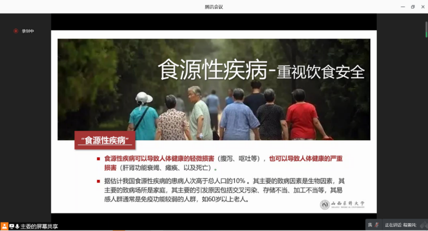 山西医科大学的程景明教授以“食源性疾病—重视饮食健康“为题目汇报了老年人饮食安全与食源性疾病,分析了影响老年人对食源性致病菌易感性的因素,包括营养膳食不平衡、抗生素的过度使用、慢性疾病、身体功能老化和缺乏运动及不恰当运动等方面;提出饮食营养与老年健康有密切关系,老年人食源性疾病致死率较高,加强老年人饮食安全教育重要性。