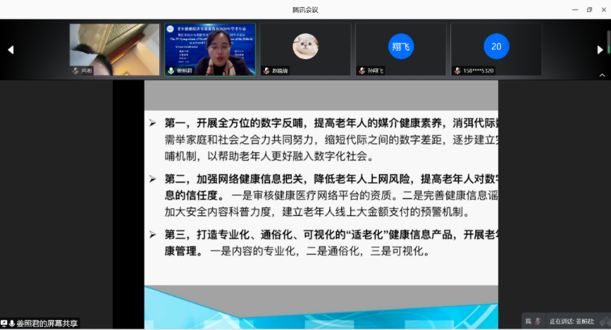 南京航空航天大学姜照君博士报告《健康老龄化与老年人的数字化生存》,揭示了在数字化的网络社会里,时空分离令网络媒体成了连接人类最小公分母,老年人了解现实社会信息、与子女等家庭成员沟通大多通过互联网,并分析了在这样的社会环境下,社会应第一,开展全方位的数字反哺,提高老年人的媒介健康素养,以消弭代际鸿沟;第二,加强网络健康信息把关,降低老年人上网风险,提高老年人对数字化信息的新人度;第三,打造专业化、通俗化、可视化的“适老化”健康信息产品,开展老年健康管理。