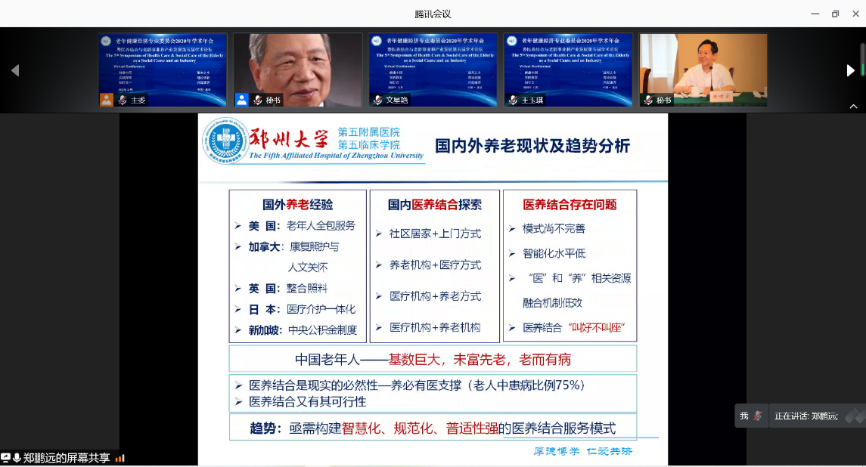 郑大五附院郑鹏远院长以“河南省郑州市利用三甲医院资源精准破解医养结合难题”为主题立足医养领域主要问题,结合郑大五附院的构建的“医-养-社-家”全链式智慧医养结合服务模式,对未来医养结合提出建议:各省建立医养结合大数据中心,建议政府从补贴、医保等方面大力支持,进一步加强全民主动健康教育,加大力度培养医养结合人才。