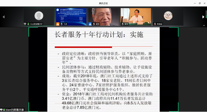 对于特别行政区,来自澳门大学的教授卞鹰博士讲述了《澳门特别行政区回归20年人口老龄化及老龄健康服务政策分析》。介绍了澳门实施了长者服务十年行动计划,政府担当领导职责,民间团体通过财政辅助,截至2018年底,澳门社工局通过上述形式支持了3家长者综合服务中心,18家安老院,11间长者日间中心等,民间机构长者服务共计投资3.41亿澳门币。从维护老年人生命健康的角度介绍了澳门特别行政区医疗卫生服务体系和照护体系,并以粤港澳大湾区视角展望了由上述两个体系融合构建的澳门老年人健康照顾体系的发展方向。