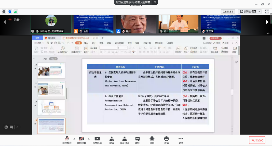 由哈尔滨医科大学教授李莉博士汇报了《老年健康评估》,梳理了国内外常用的老年健康评估工具、适用范围以及存在的问题,同时根据我国老年健康评估的现状、不足之处,提出加强评估机构和人才队伍建设,制定综合性评估工具,医院评估与上门评估相结合和加强监督管理等方式优化和完善老年健康评估方法。