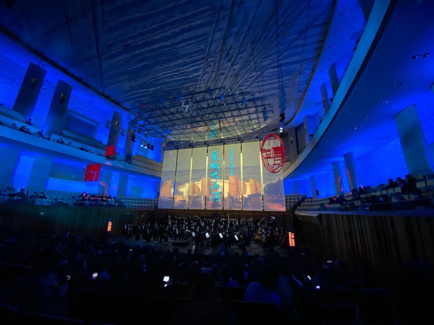 不同于一般的音乐会,《京城大运河》演出极具仪式感、可视感,从起光到收光,一个半小时的演出一气呵成、气韵流畅。以“船帆”为主体意向的多媒体大屏幕,可以自由升降,模拟运河上的帆起帆落,营造出层叠有序的舞台空间感,同时以字幕形式打出大运河历史背景,为观众传递更多信息。音画相得益彰,为观众描摹着古往今来不同历史时期大运河的景象。