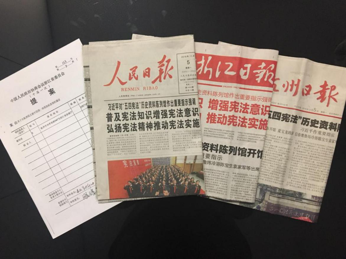 作为该提案的实施单位,杭州市委市政府高度重视,主要领导亲自批示,市人大具体牵头负责,经过8年不懈努力,在国家有关方面的关心支持下,2016年12月4日,在第三个全国宪法日、新中国第一部宪法“五四宪法”历史资料陈列馆正式开馆。