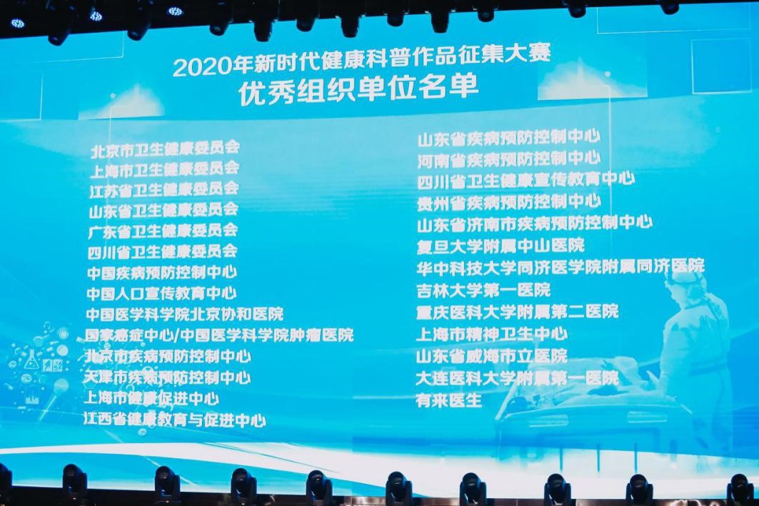 “健康知识普及行动——2020年新时代健康科普作品征集大赛”旨在进一步推进健康中国行动——健康知识普及行动,普及健康科学知识,推广文明健康的生活方式,在全社会营造良好的“学健康知识、享健康生活”的氛围。今年大赛共征集到5大类9140件作品,其中视频类作品4539件,评选出视频类优秀作品88件,并评出优秀组织单位27家。有来医生一举荣获微视频类优秀作品、长视频类优秀作品、优秀组织单位三个奖项。