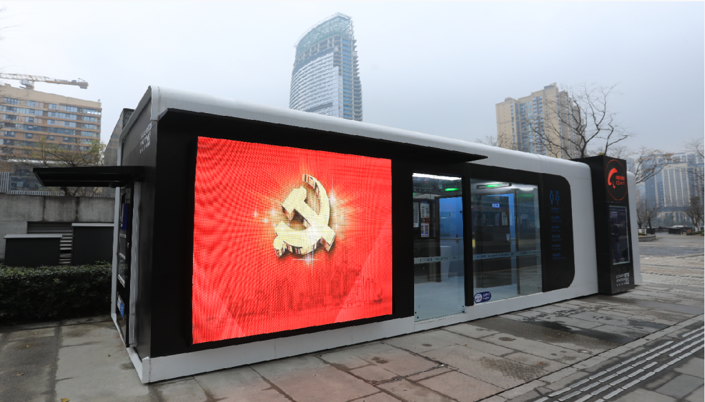 在空间内外,分设有京东方提供的4平方米的智慧大屏和两个55寸的科技画屏,可用于政务信息发布、旅游资讯发布、城市宣传片播放、社区安全注意事项播放等。更值得一提的是,轻松驿站内还加入了很多暖心设计,比如小孩换衣板、残疾人扶手,残疾人如厕通道,以及可以自行扫码购买的卫生用品、智慧电视点播节目、互联网线上商城等。轻松驿站还拥有外观设计、新型材料、智能控制、节能洁具、先进处理器等30项专利,是目前中国智能物联网厕所的典范代表。不仅如此,还包含了共享充电宝、共享雨伞、共享纸巾、自动测温、自助药箱等便民设施,真正成了百姓方便暖心的“轻松驿站”。