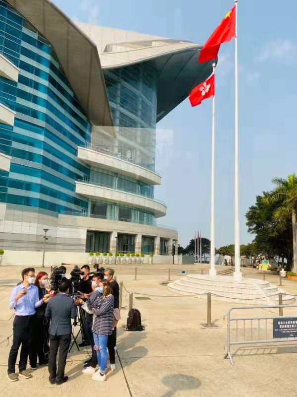 “到北京去,参加春天的聚会!”图为3月2日,来自港区的全国政协委员和人大代表们在金紫荆广场集合出发,引来香港媒体围观采访。特邀委员记者 陈卓禧 摄