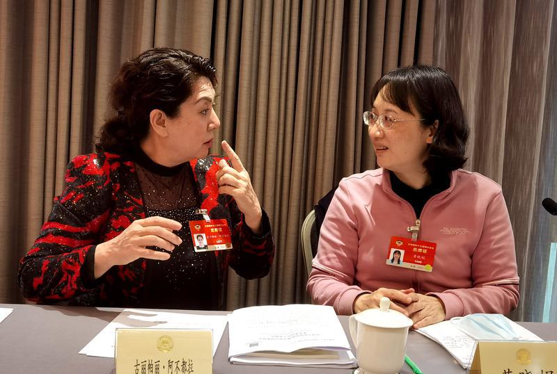 争鸣! 3月5日在教育42组小组讨论会上,古丽帕丽?阿不都拉委员(左)和黄晓娟委员开启热烈讨论。 特邀委员记者 唐江澎摄