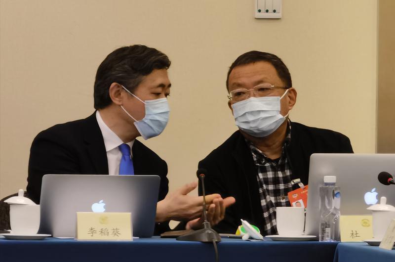 3月5日,无党派界李稻葵委员(左)与杜卫委员一起讨论全国政协常委会工作报告。特邀委员记者 马东平 摄