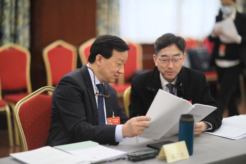 3月5日下午,医卫45组政协委员黄宇光(左)与来自香港的政协委员高永文,在小组讨论会议上,就国民经济和社会发展“十四五”规划和二〇三五年远景目标纲要草案进行交流。 特邀委员记者 徐凤芹摄