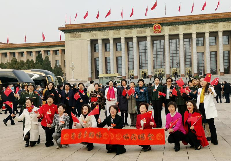 3月7日上午,妇联界的委员们在会前拍照留影,并相互送上节日的祝福。特邀委员记者 武义青摄