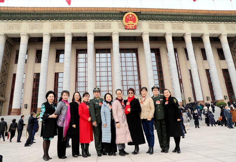 3月7日,全国政协十三届四次会议第二次全体大会会后,籍薇、金萍、卢永琇、李瑛、郭瓦?加毛吉、刘月宁、奚美娟、董圆圆、盛小云、陈力、龙倩(从左至右十一位委员)一起开心合影,迎接第二天妇女节的到来。 特邀委员记者 王建国 摄