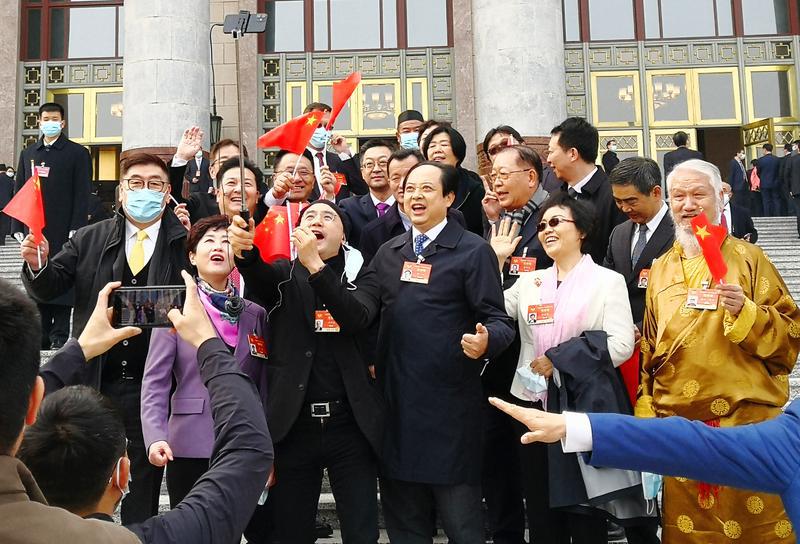 3月10日,全国政协十三届四次会议下午圆满闭幕,委员们聚在大会堂前合影留念。特邀委员记者朱定真摄