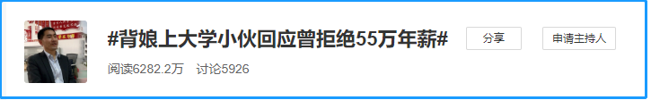 昨天,一个 #背娘上大学小伙回应曾拒绝55万年薪# 的话题冲上热搜榜,迅速获得六千多万阅读量。