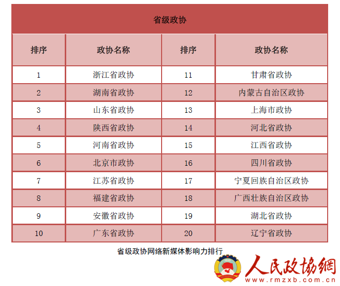 省级政协网络新媒体影响力排行:浙江省、湖南省、山东省、陕西省、河南省、北京市、江苏省、福建省、安徽省、广东省、甘肃省、内蒙古自治区、上海市、河北省、江西省、四川省、宁夏回族自治区、广西壮族自治区、湖北省、辽宁省。