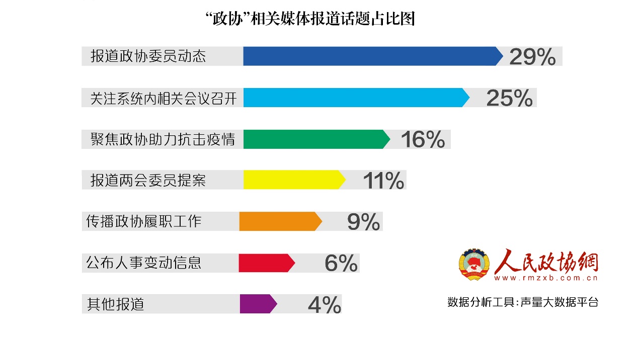 《报告》通过对媒体报道分析梳理得出:关于政协委员动态、关注政协系统内相关会议召开、聚焦人民政协助力抗击新冠肺炎疫情、报道两会政协委员提案、传播政协履职工作、公布人事变动信息等话题受关注度较高。通过对网民言论分析梳理得出:热议委员两会提案、聚焦政协系统内会议、关注认可政协工作、讨论政协委员表态发言、关注政协人事任免、监督政协干部行为规范等话题受网民关注度较高。
