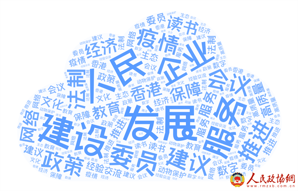 从涉“政协”的热词分析来看,发展、建设、企业、委员、推进、会议、经济、疫情、人民、建议、服务、教育、文化等词汇在网络上出现的频率较高,提及频次均超过千万。
